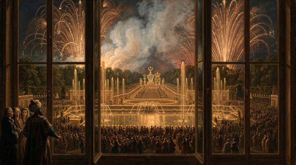 Departure: after dinner, Çelebi Mehmed admires the magnificent show held in a garden illuminated by thousands of lamps, turning night into day. As a mark of respect to the Ottoman Sultan, fireworks formed a “Crescent” in the sky topped with a “Crown,” leaving a profound impression on the ambassador.