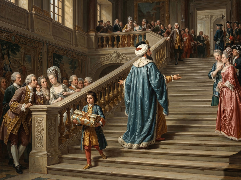 The Delegation on the Staircase: when Çelebi Mehmed reached the palace gate, he got off his horse and was taken to a private room to rest. Then, greeted by officials on each floor, he went up the stairs and passed through the large crowd to enter the Divanhane (reception hall), where the official meeting would take place.