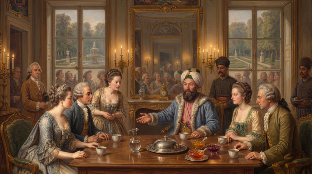 Offering of Coffee and Jam : according to Saint-Simon, the noblewomen of the palace and the city had made it a custom to pay visits to the Ottoman ambassador. Çelebi Mehmed frequently welcomed these ladies with coffee and jam, offering them a refined treat. Through these graceful gatherings, he strengthened the cultural exchange between the two worlds.